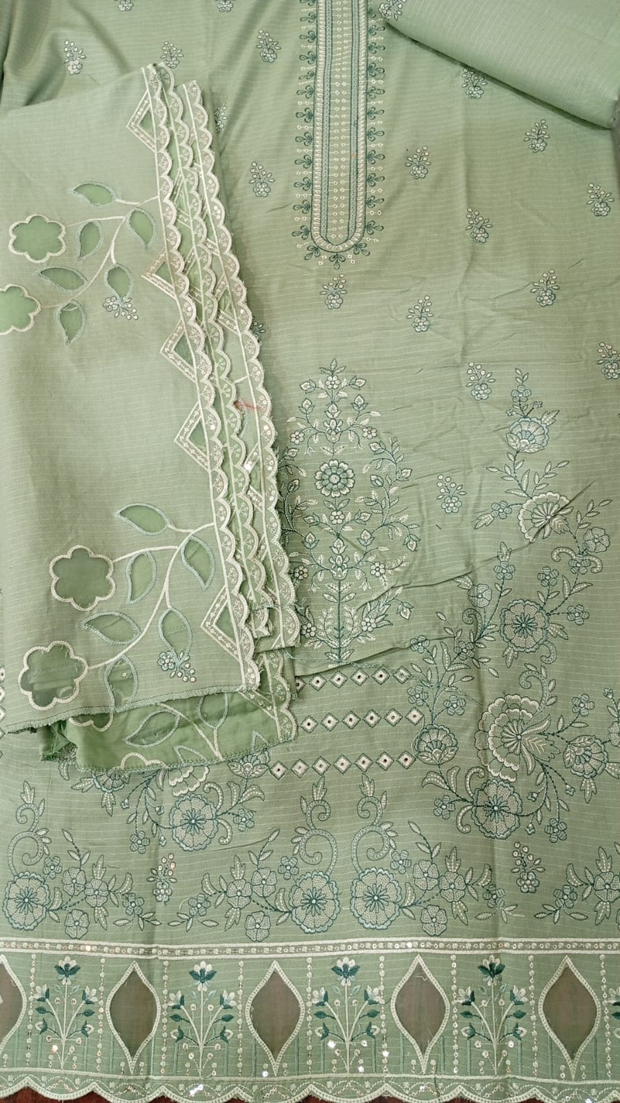 Dhanak marina 3pc, embroidered cutwork shirt plan trouser nd cutwork dupata..(pista green shade)
