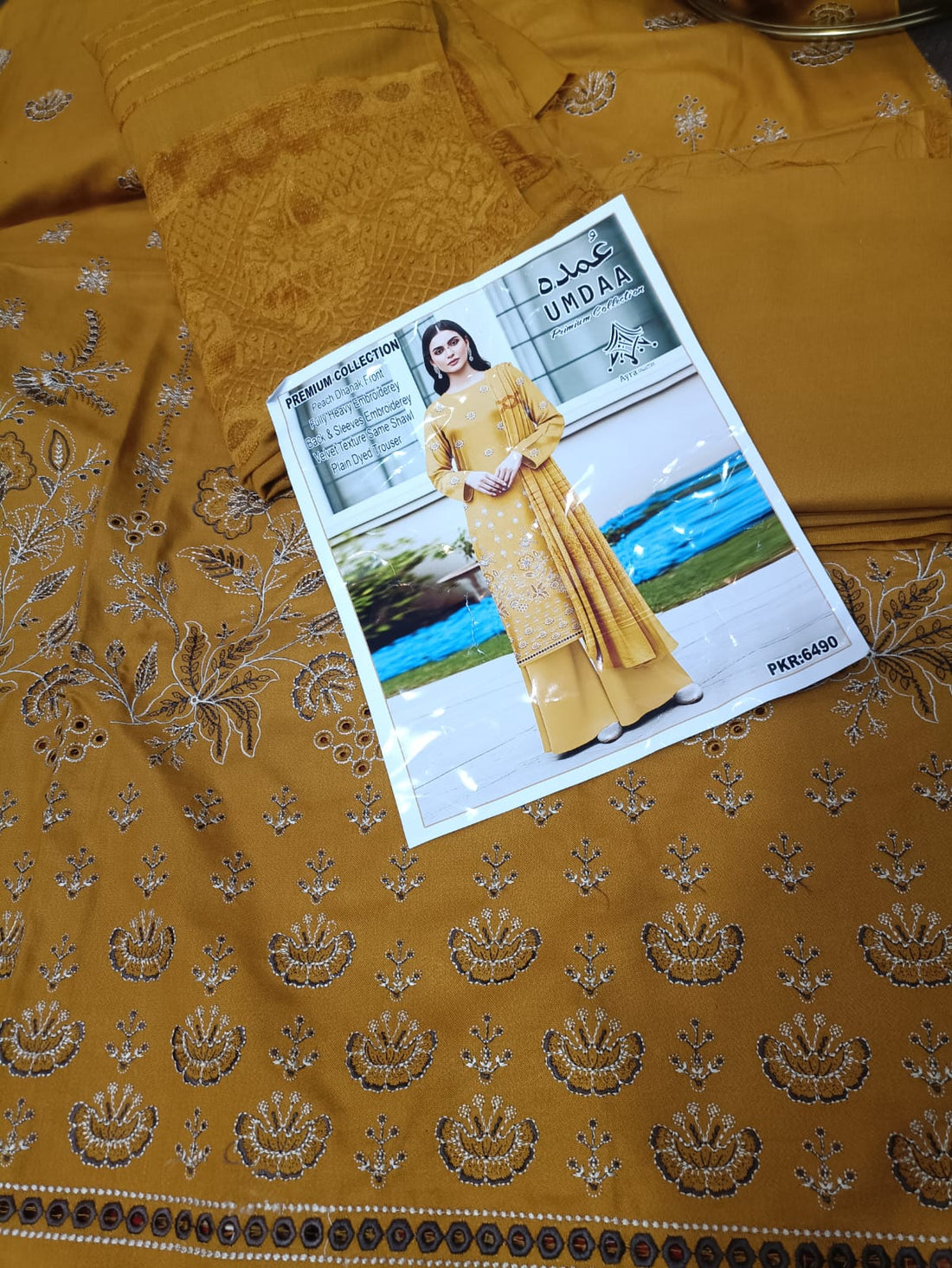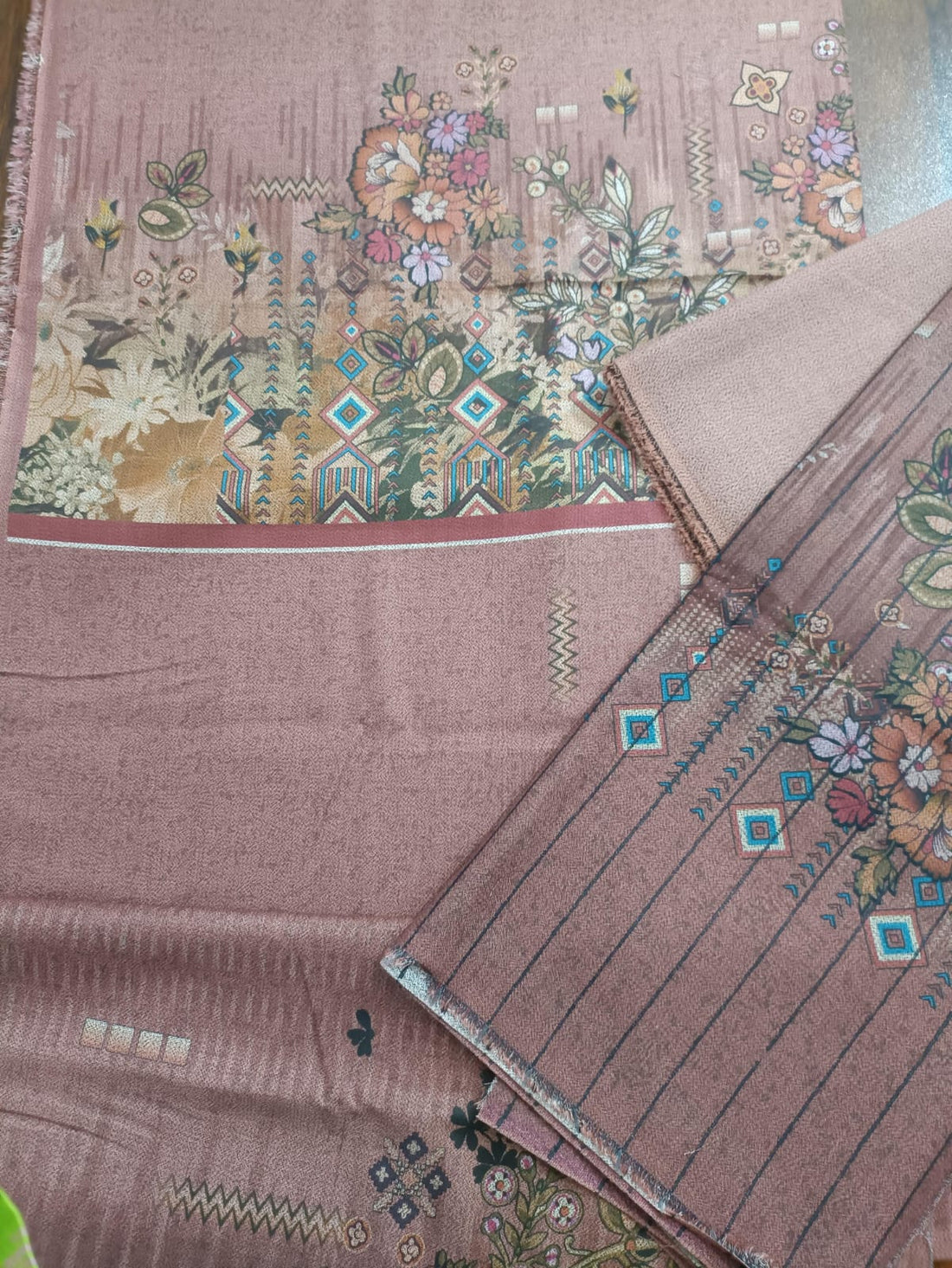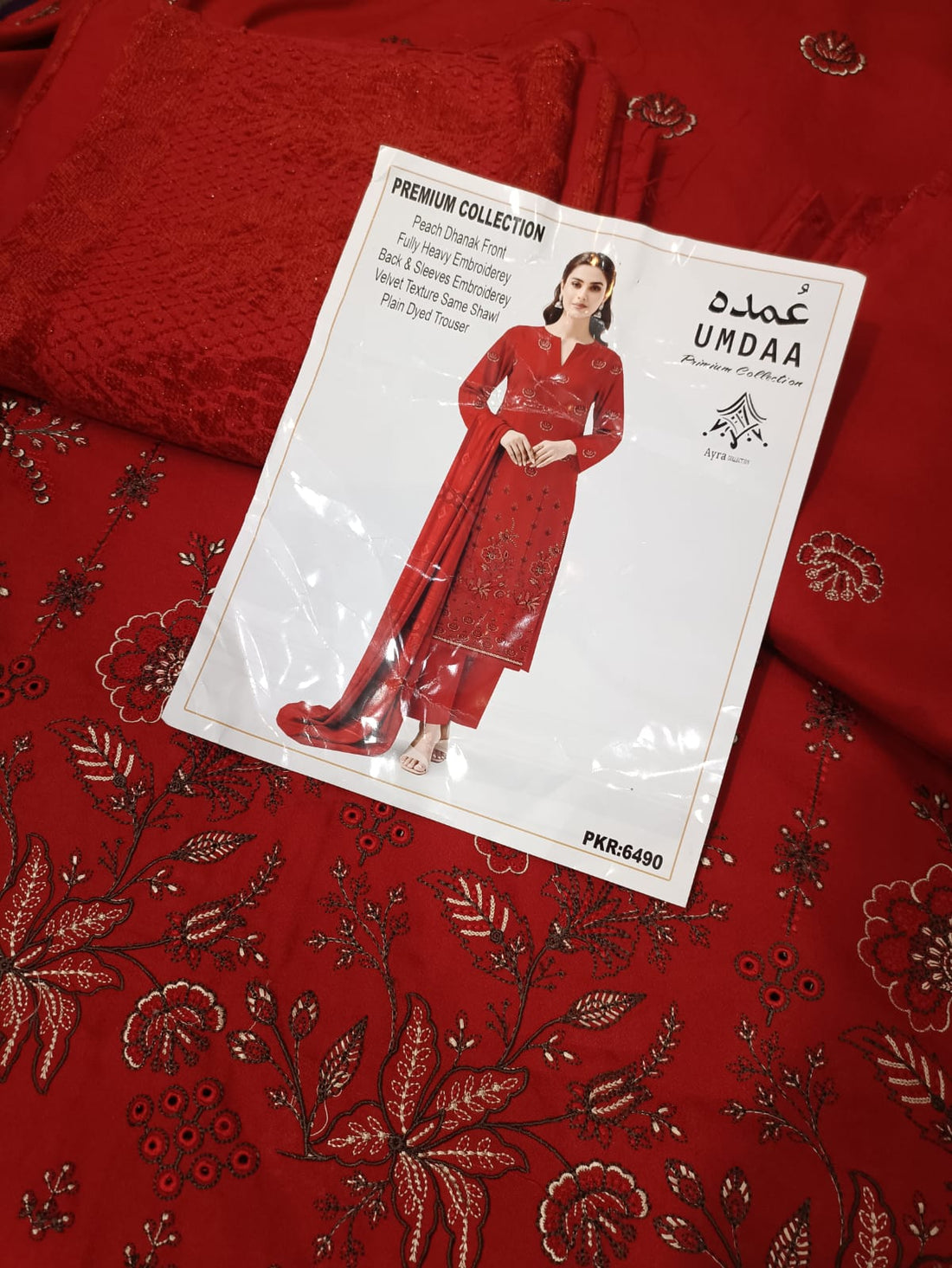 Peach dhanak 3pc, embroidered front back nd sleeves wd plan trouser nd velvet dhanak shawl....