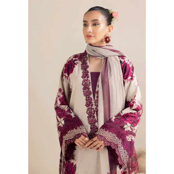 The Adan Libas Printer Marginda Purple Lawn Suite offers a sophisticated blend of intricate prints and delicate embroidery, perfect for those seeking elegance in lightweight fabrics. This ensemble features a beautifully printed lawn front, back, and sleeves, complemented by embroidered patches and a finely detailed lace neck that add depth and texture. The printed chiffon dupatta enhances the overall look with its graceful flow, while the printed trousers complete the outfit with coordinated style. Ideal for warm weather, this suite combines comfort with expert craftsmanship, making it a refined choice for formal and semi-formal occasions.