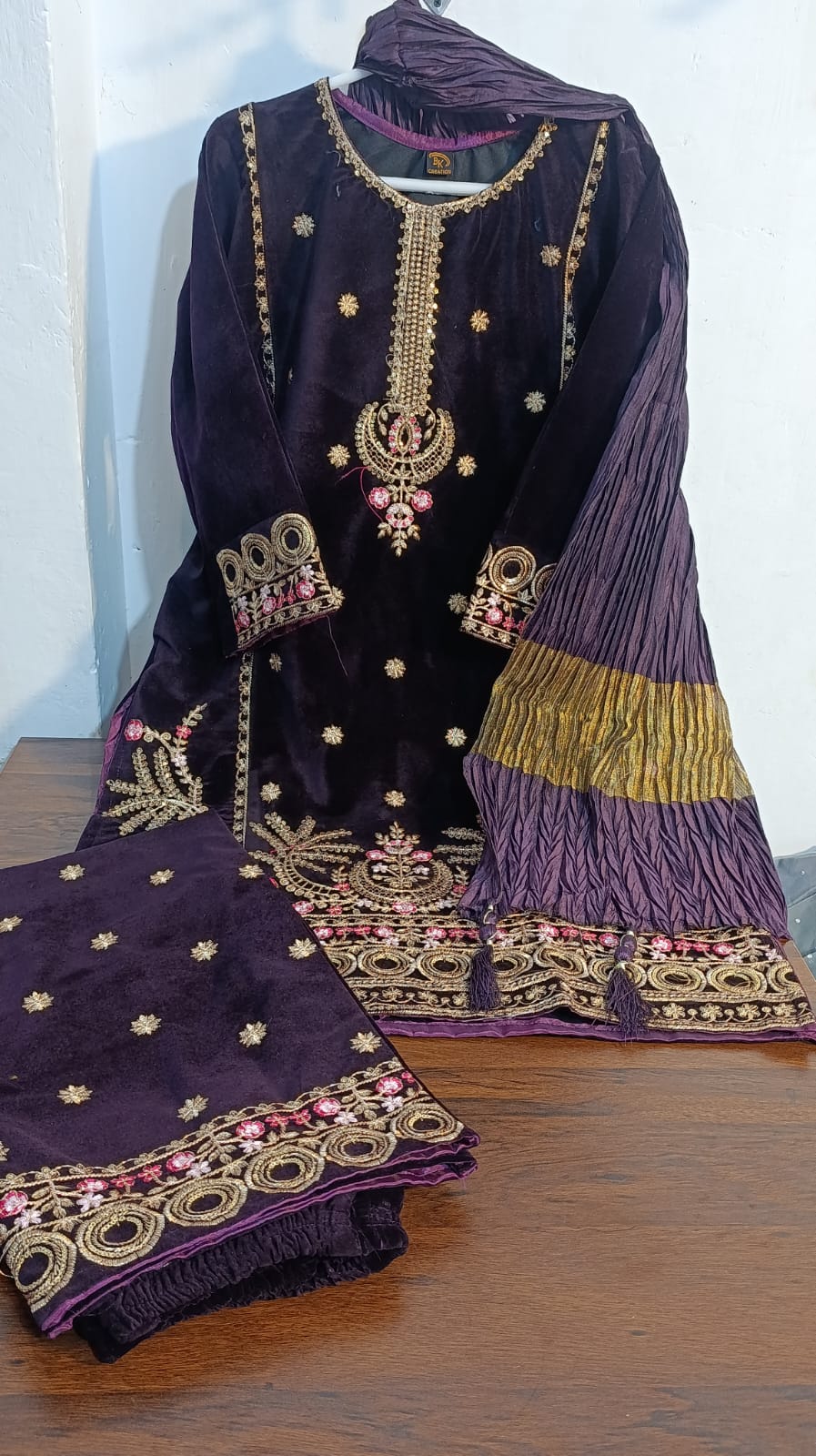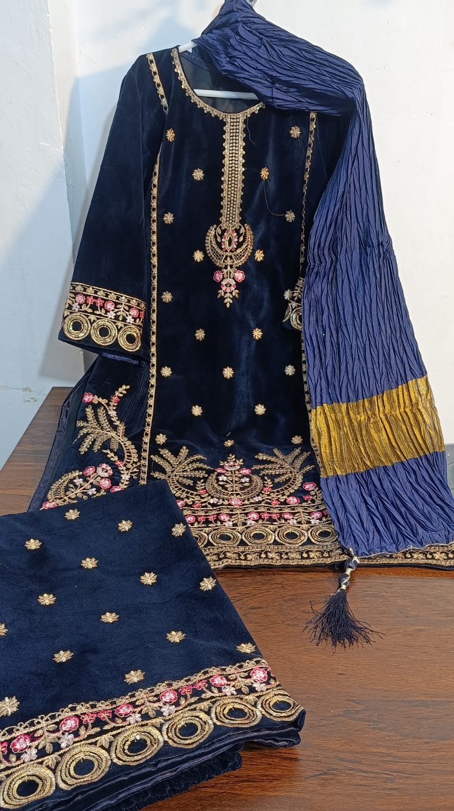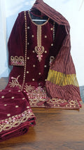 Expertly crafted for the fashion-forward, the Champion velvet 3pc embroidery elevates your wardrobe with its luxurious velvet material and intricate zari crush dupata. Available only in 20 chest size, this 3-piece set features a beautifully embroidered shirt and trouser for a stunning and timeless look.