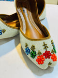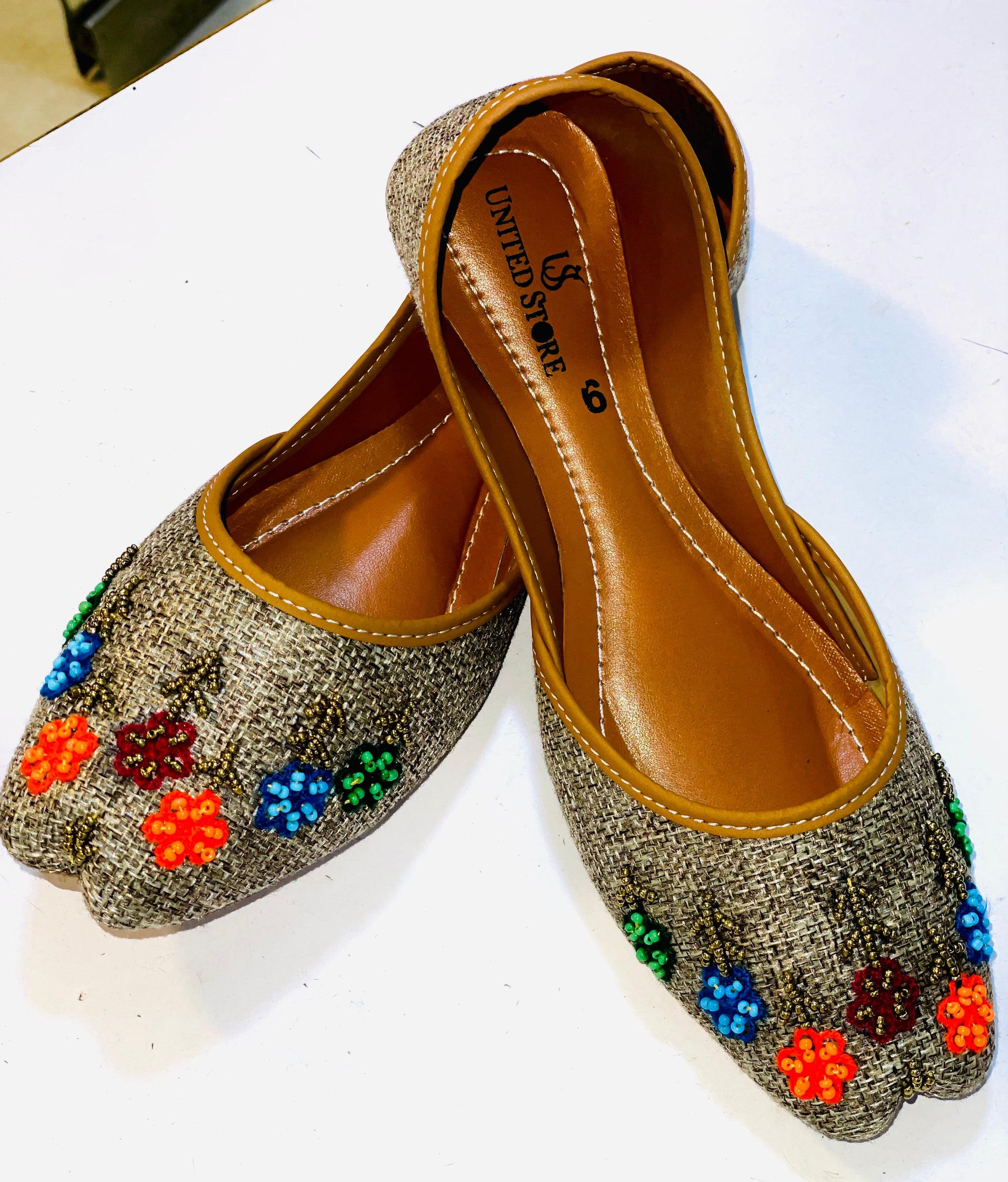 Expertly handcrafted with a unique blend of jute and denim fabrics, these khussa shoes offer a stylish and eco-friendly option for footwear. The intricate handmade work adds a touch of artistry, while the durable materials provide comfort and long-lasting wear. A perfect combination of style and sustainability.