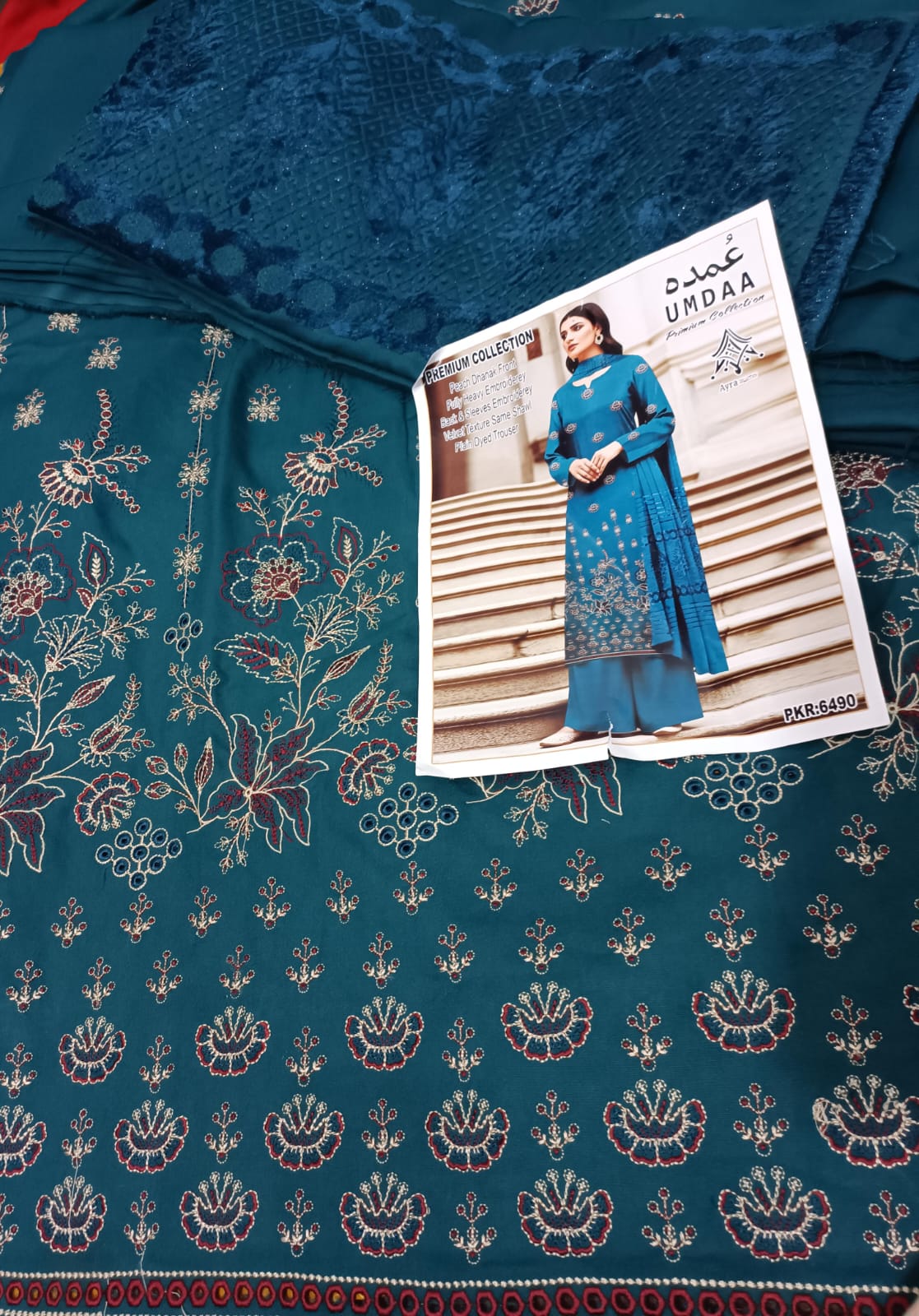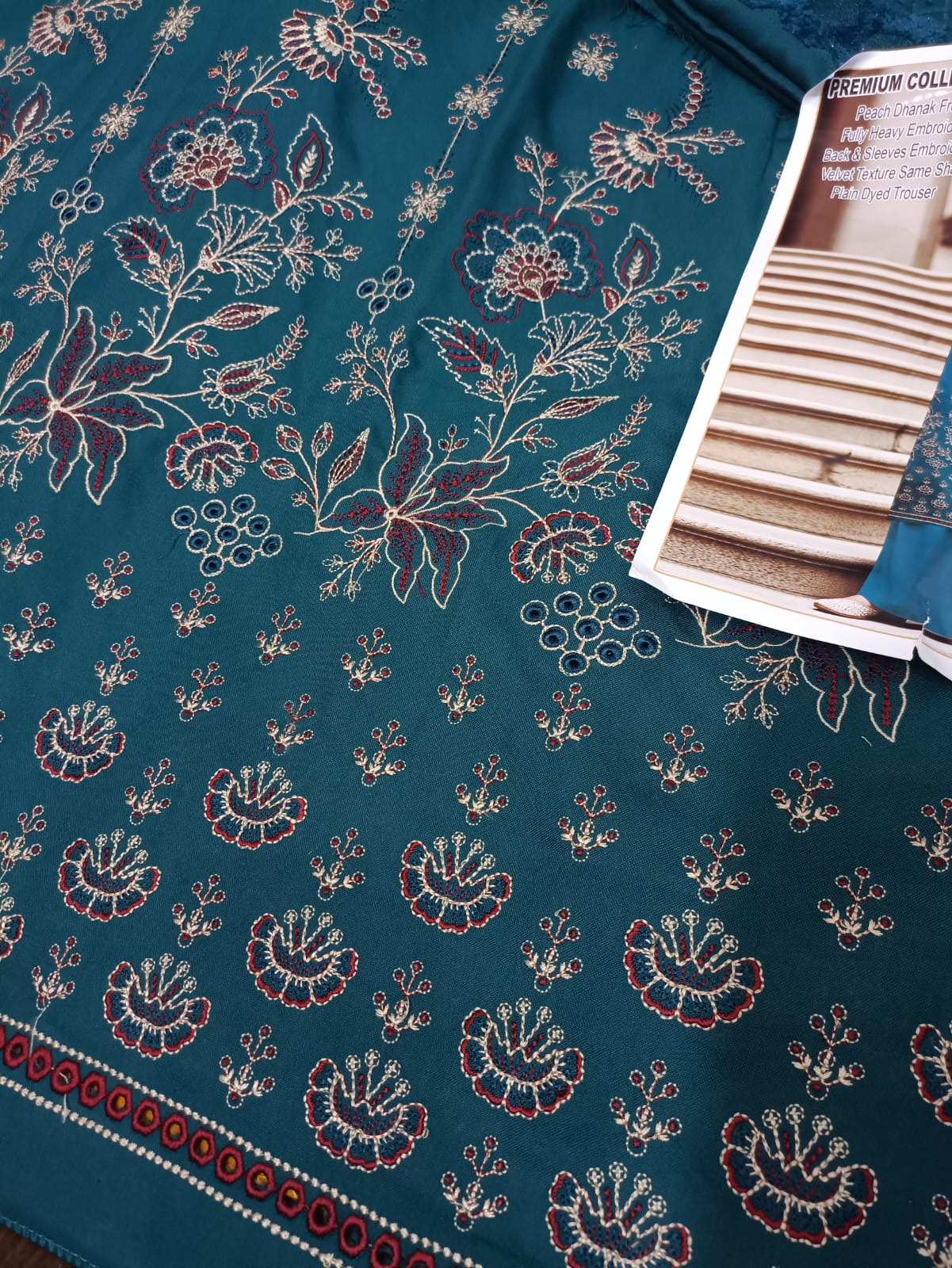 Peach dhanak 3pc, embroidered front back nd sleeves wd plan trouser nd velvet dhanak shawl....