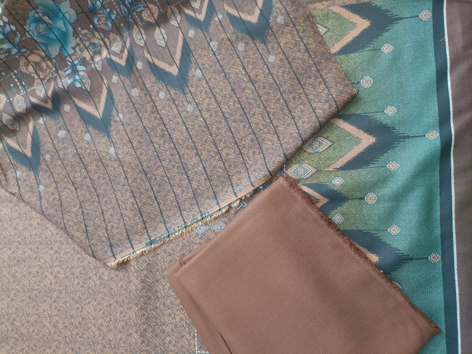 Elevate your wardrobe with this exquisite three-piece ensemble crafted from premium printed dhanak fabric. The collection features a beautifully printed shirt paired with coordinating plan trousers, enhanced with luxurious velvet strip lining for added sophistication. Complete the look with the included matching shawl, perfect for layering and versatility. Ideal for both casual gatherings and formal occasions, this set combines traditional aesthetics with contemporary comfort. The quality construction and thoughtful design details make it a timeless addition to your collection.